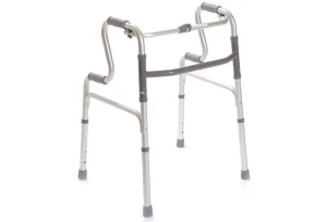 Fiksna dvostopenjska hodulja iz aluminija, z oblazinjenima ročajema (dve višini) in nedrsečimi gumijastimi natiki. Hodulja je enostavno zložljiva s pritiskom na gumb.
