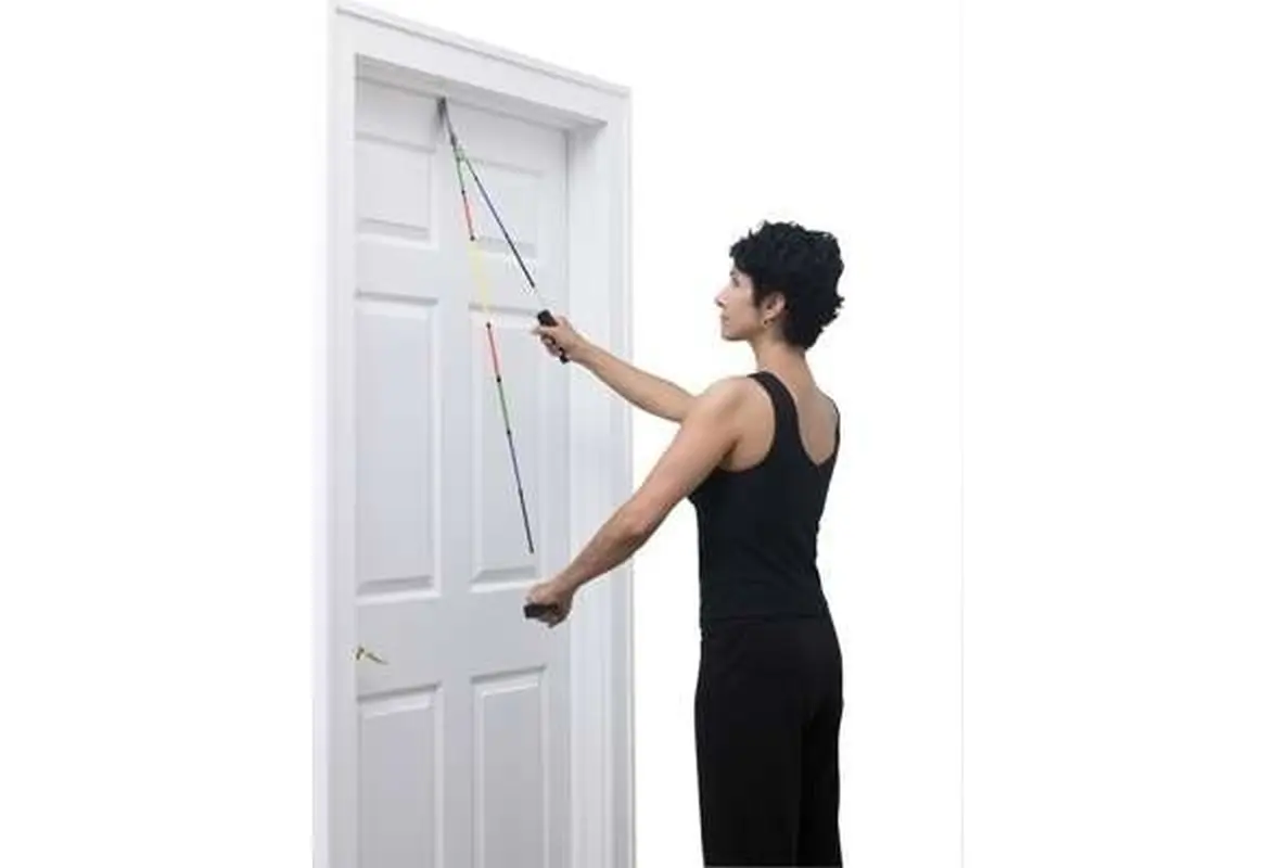 Ta preprost pripomoček lahko pritrdimo na vrata s pomočjo TheraBand vratnega zatiča. Udobje pri vadbi vam omogočata oblazinjena ročaja.